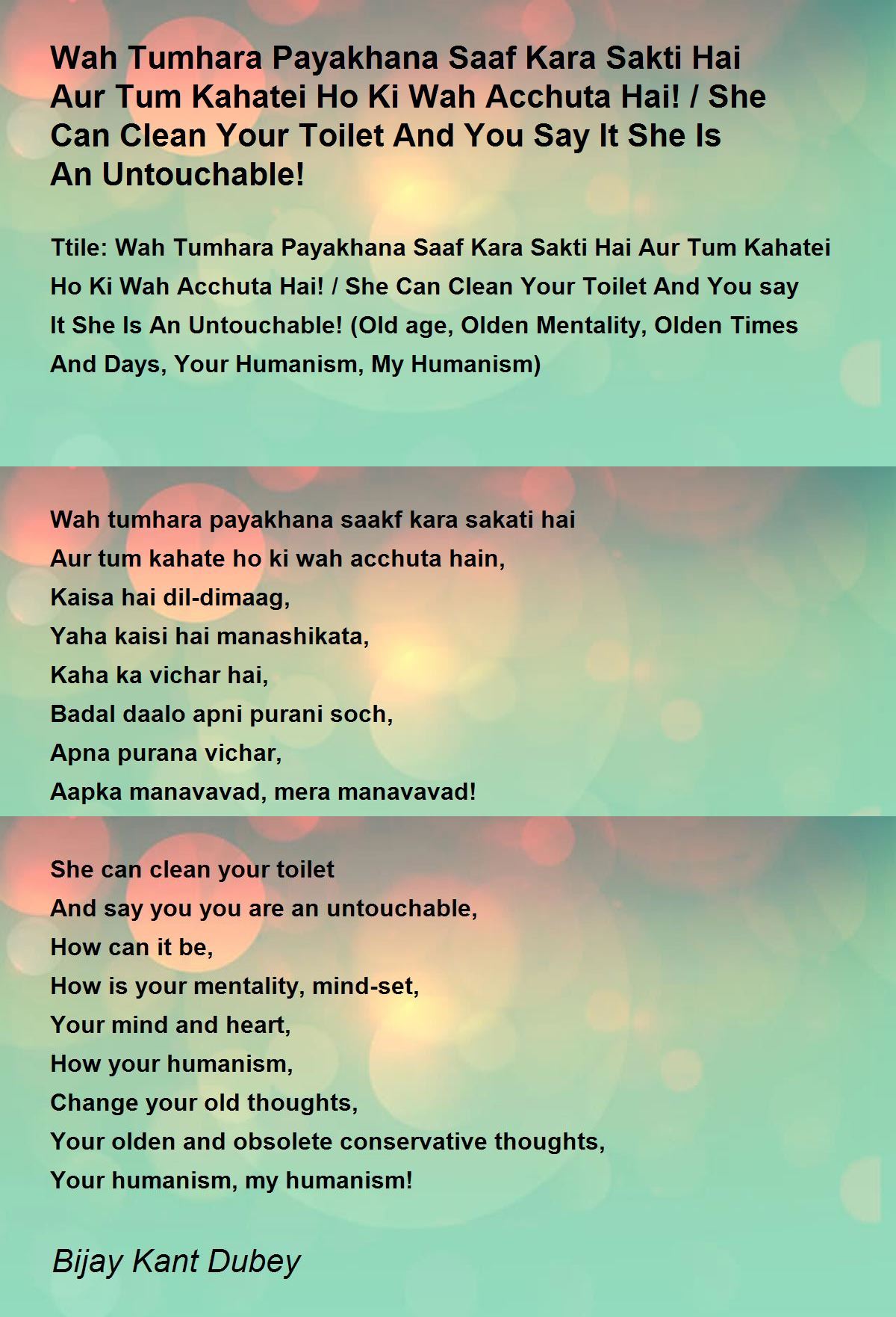 Ttile: Wah Tumhara Payakhana Saaf Kara Sakti Hai Aur Tum Kahatei Ho Ki Wah Acchuta Hai! / She Can Clean Your Toilet And You say It She Is An Untouchable! (Old age, Olden Mentality, Olden Times And Days, Your Humanism, My Humanism)