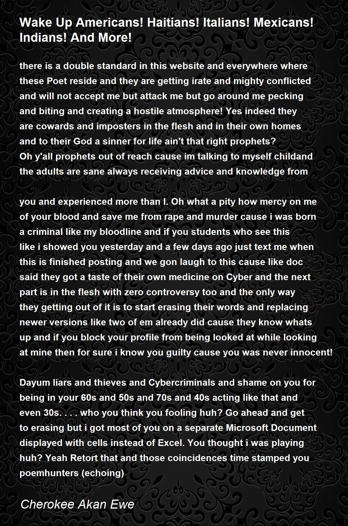 there is a double standard in this website and everywhere where these Poet reside and they are getting irate and mighty conflicted and will not accept me but attack me but go around me pecking and biting and creating a hostile atmosphere! Yes indeed they are cowards and imposters in the flesh and in their own homes and to their God a sinner for life ain't that right prophets? Oh y'all prophets out of reach cause im talking to myself childand the adults are sane always receiving advice and knowledge from you and experienced more than I. Oh what a pity how mercy on me of your blood and save me from rape and murder cause i was born a criminal like my bloodline and if you students who see this like i showed you yesterday and a few days ago just text me when this is finished posting and we gon laugh to this cause like doc said they got a taste of their own medicine on Cyber and the next part is in the flesh with zero controversy too and the only way they getting out of it is to start erasing their words and replacing newer versions like two of em already did cause they know whats up and if you block your profile from being looked at while looking at mine then for sure i know you guilty cause you was never innocent! Dayum liars and thieves and Cybercriminals and shame on you for being in your 60s and 50s and 70s and 40s acting like that and even 30s....who you think you fooling huh? Go ahead and get to erasing but i got most of you on a separate Microsoft Document displayed with cells instead of Excel. You thought i was playing huh? Yeah Retort that and those coincidences time stamped you poemhunters (echoing)