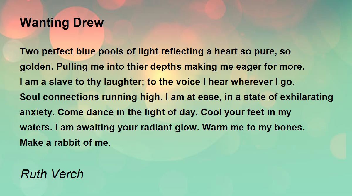 Two perfect blue pools of light reflecting a heart so pure, so golden. Pulling me into thier depths making me eager for more. I am a slave to thy laughter; to the voice I hear wherever I go. Soul connections running high. I am at ease, in a state of exhilarating anxiety. Come dance in the light of day. Cool your feet in my waters. I am awaiting your radiant glow. Warm me to my bones. Make a rabbit of me.