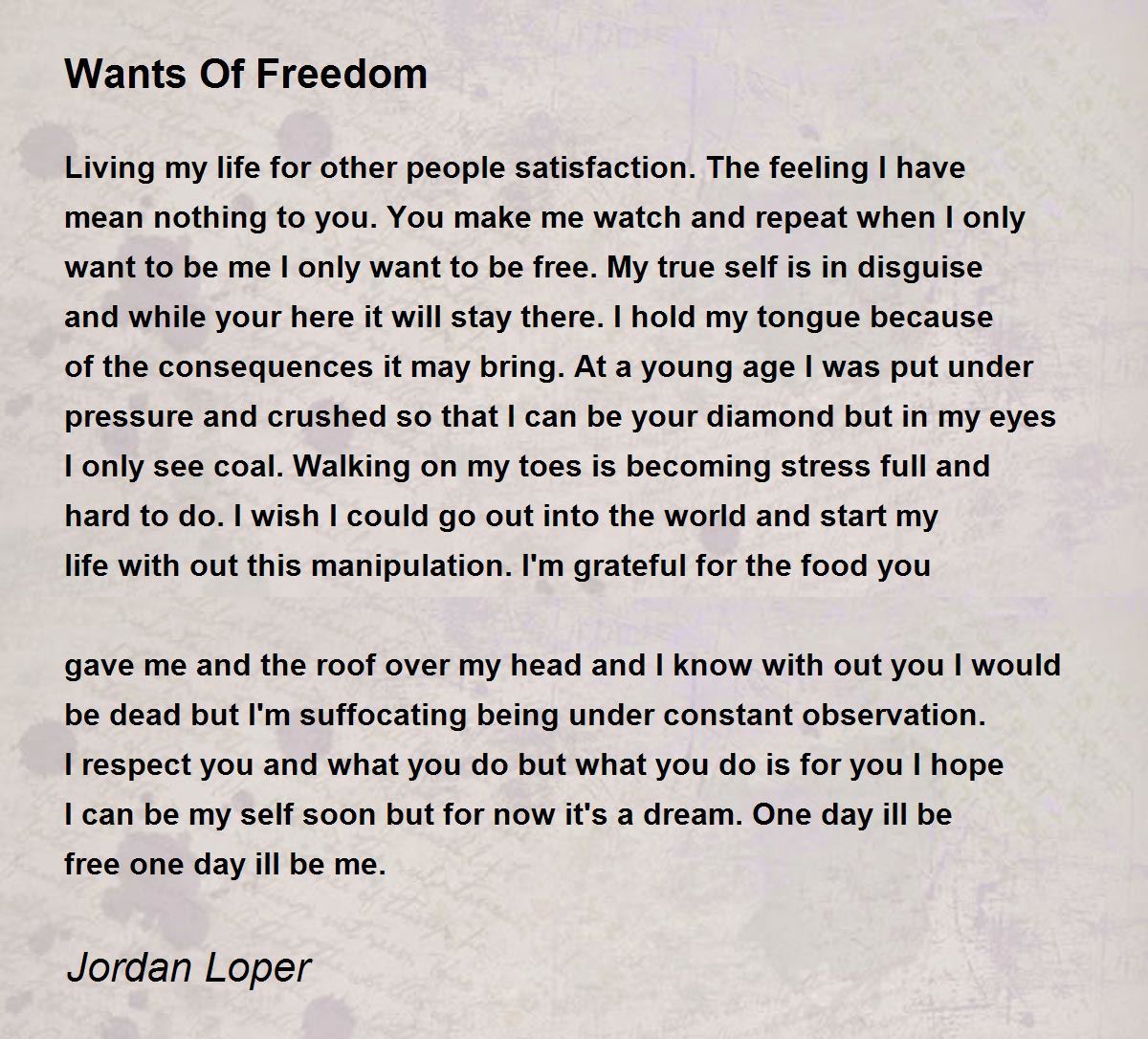 Living my life for other people satisfaction. The feeling I have mean nothing to you. You make me watch and repeat when I only want to be me I only want to be free. My true self is in disguise and while your here it will stay there. I hold my tongue because of the consequences it may bring. At a young age I was put under pressure and crushed so that I can be your diamond but in my eyes I only see coal. Walking on my toes is becoming stress full and hard to do. I wish I could go out into the world and start my life with out this manipulation. I'm grateful for the food you gave me and the roof over my head and I know with out you I would be dead but I'm suffocating being under constant observation. I respect you and what you do but what you do is for you I hope I can be my self soon but for now it's a dream.One day ill be free one day ill be me.