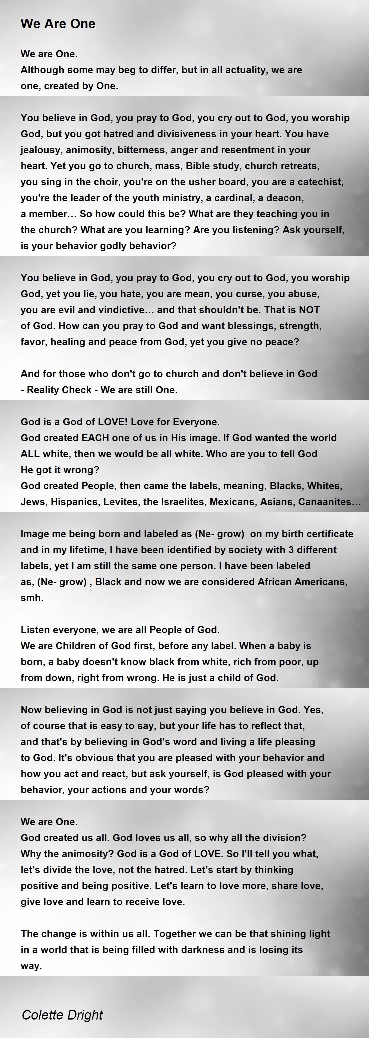 Although some may beg to differ, but in all actuality, we are one, created by One.