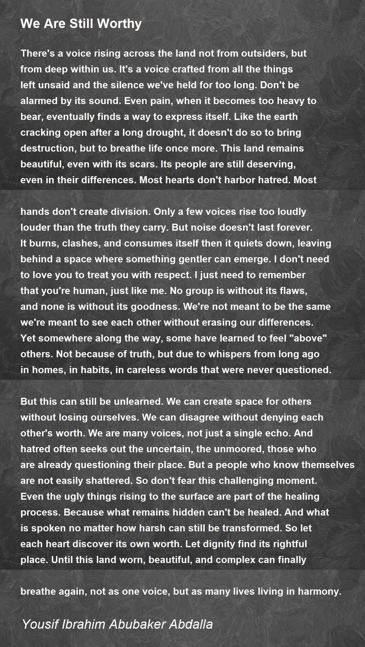 There's a voice rising across the land not from outsiders, but from deep within us. It's a voice crafted from all the things left unsaid and the silence we've held for too long. Don't be alarmed by its sound. Even pain, when it becomes too heavy to bear, eventually finds a way to express itself. Like the earth cracking open after a long drought, it doesn't do so to bring destruction, but to breathe life once more. This land remains beautiful, even with its scars. Its people are still deserving, even in their differences. Most hearts don't harbor hatred. Most hands don't create division. Only a few voices rise too loudly louder than the truth they carry. But noise doesn't last forever. It burns, clashes, and consumes itself then it quiets down, leaving behind a space where something gentler can emerge. I don't need to love you to treat you with respect. I just need to remember that you're human, just like me. No group is without its flaws, and none is without its goodness. We're not meant to be the same we're meant to see each other without erasing our differences. Yet somewhere along the way, some have learned to feel "above" others. Not because of truth, but due to whispers from long ago in homes, in habits, in careless words that were never questioned. But this can still be unlearned. We can create space for others without losing ourselves. We can disagree without denying each other's worth. We are many voices, not just a single echo. And hatred often seeks out the uncertain, the unmoored, those who are already questioning their place. But a people who know themselves are not easily shattered. So don't fear this challenging moment. Even the ugly things rising to the surface are part of the healing process. Because what remains hidden can't be healed. And what is spoken no matter how harsh can still be transformed. So let each heart discover its own worth. Let dignity find its rightful place. Until this land worn, beautiful, and complex can finally breathe again, not as one voice, but as many lives living in harmony.