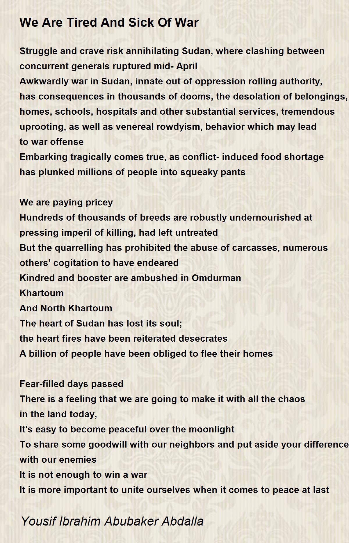 Awkwardly war in Sudan, innate out of oppression rolling authority, has consequences in thousands of dooms, the desolation of belongings, homes, schools, hospitals and other substantial services, tremendous uprooting, as well as venereal rowdyism, behavior which may lead to war offense