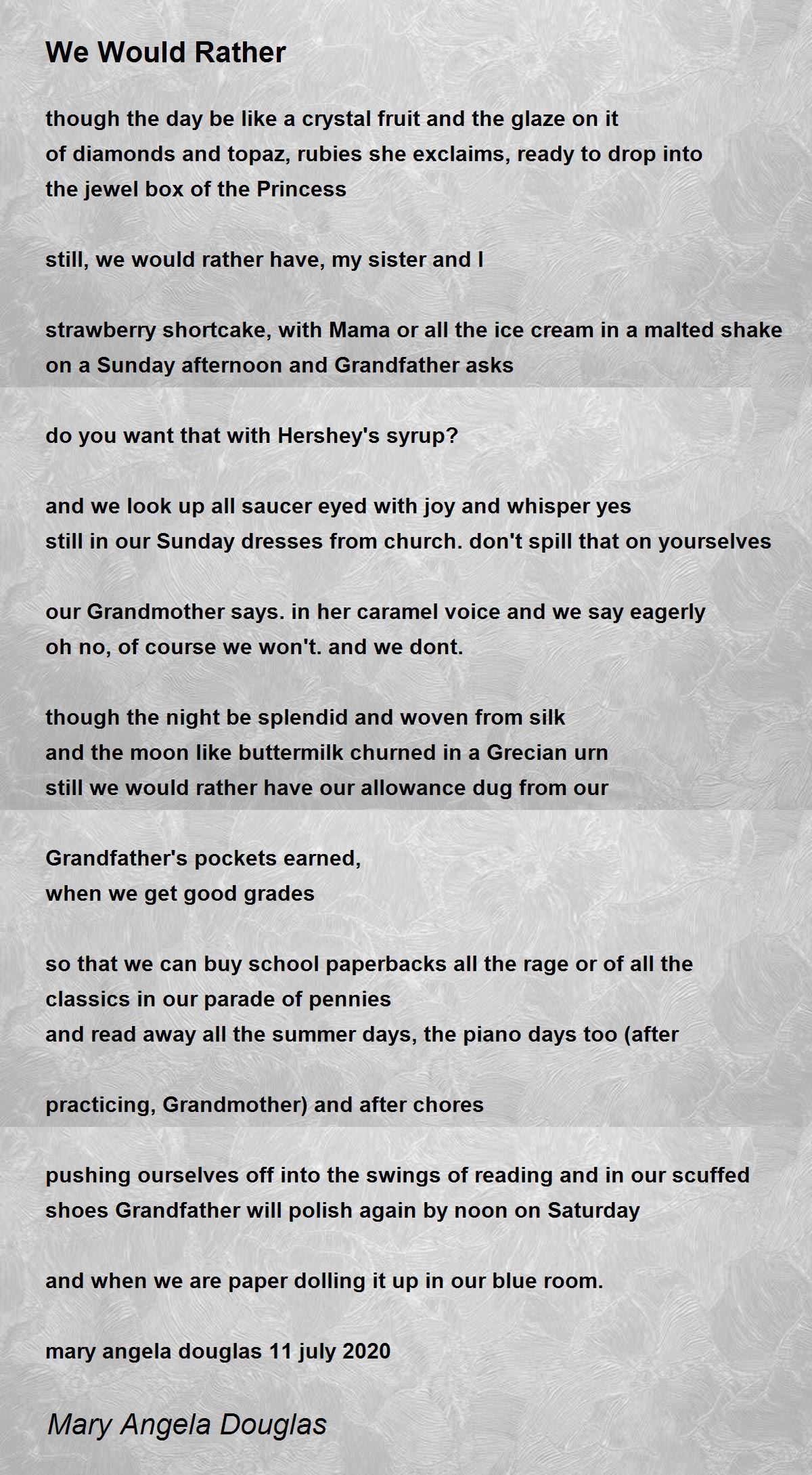 our Grandmother says. in her caramel voice and we say eagerly