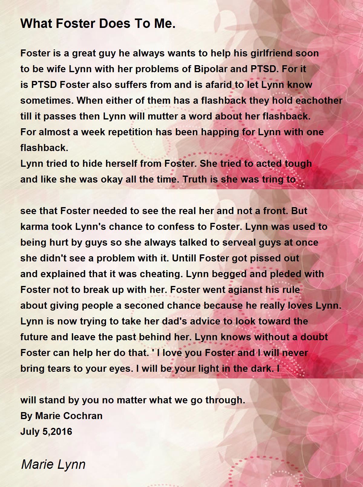 Foster is a great guy he always wants to help his girlfriend soon to be wife Lynn with her problems of Bipolar and PTSD. For it is PTSD Foster also suffers from and is afarid to let Lynn know sometimes. When either of them has a flashback they hold eachother till it passes then Lynn will mutter a word about her flashback. For almost a week repetition has been happing for Lynn with one flashback.