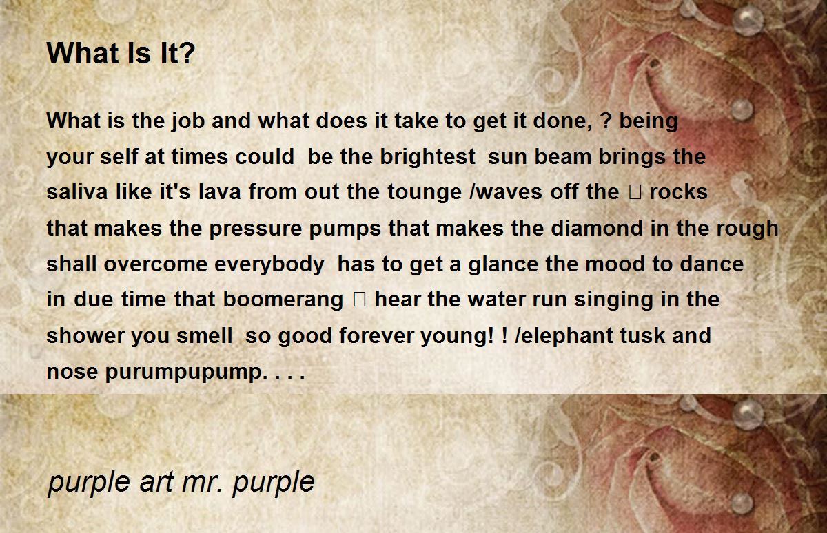 What is the job and what does it take to get it done, ? being your self at times could be the brightest sun beam brings the saliva like it's lava from out the tounge /waves off the 🪨 rocks that makes the pressure pumps that makes the diamond in the rough shall overcome everybody has to get a glance the mood to dance in due time that boomerang 🪃 hear the water run singing in the shower you smell so good forever young! ! /elephant tusk and nose purumpupump....