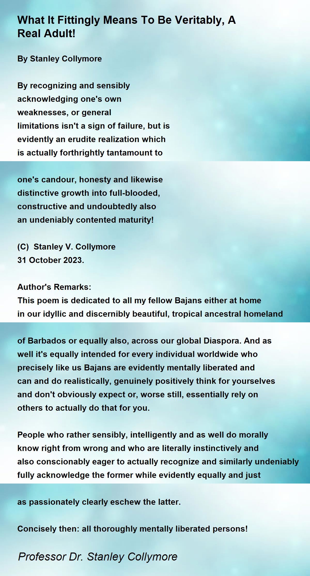 This poem is dedicated to all my fellow Bajans either at home in our idyllic and discernibly beautiful, tropical ancestral homeland of Barbados or equally also, across our global Diaspora. And as well it's equally intended for every individual worldwide who precisely like us Bajans are evidently mentally liberated and can and do realistically, genuinely positively think for yourselves and don't obviously expect or, worse still, essentially rely on others to actually do that for you.