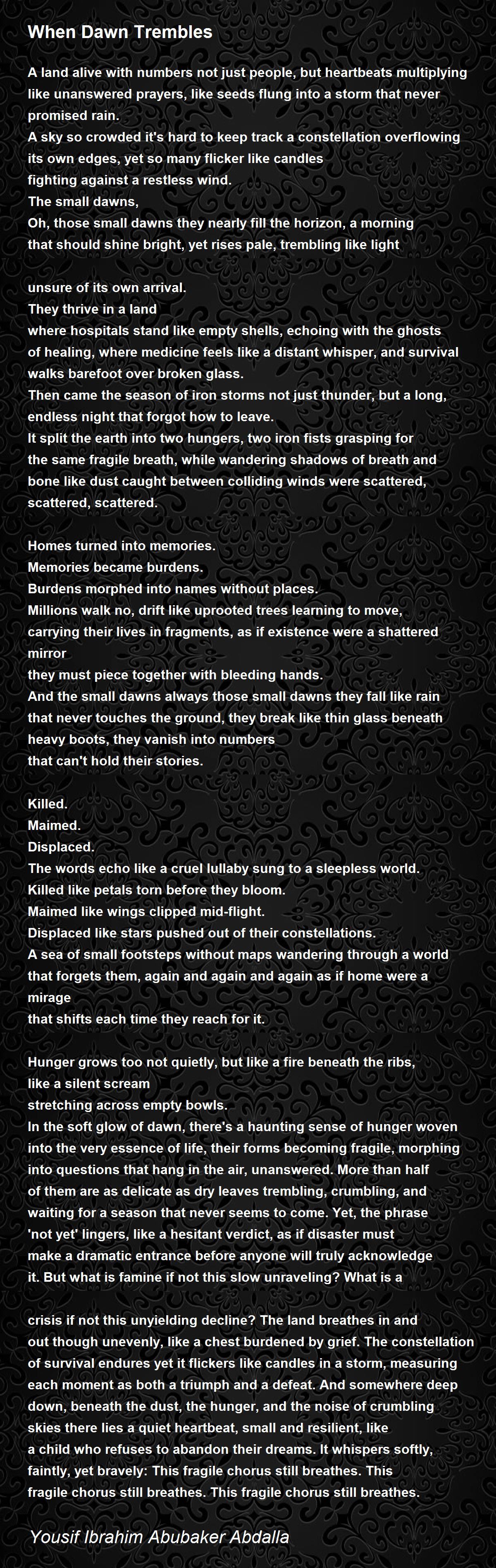 In the soft glow of dawn, there's a haunting sense of hunger woven into the very essence of life, their forms becoming fragile, morphing into questions that hang in the air, unanswered. More than half of them are as delicate as dry leaves trembling, crumbling, and waiting for a season that never seems to come. Yet, the phrase 'not yet' lingers, like a hesitant verdict, as if disaster must make a dramatic entrance before anyone will truly acknowledge it. But what is famine if not this slow unraveling? What is a crisis if not this unyielding decline? The land breathes in and out though unevenly, like a chest burdened by grief. The constellation of survival endures yet it flickers like candles in a storm, measuring each moment as both a triumph and a defeat. And somewhere deep down, beneath the dust, the hunger, and the noise of crumbling skies there lies a quiet heartbeat, small and resilient, like a child who refuses to abandon their dreams. It whispers softly, faintly, yet bravely: This fragile chorus still breathes. This fragile chorus still breathes. This fragile chorus still breathes.