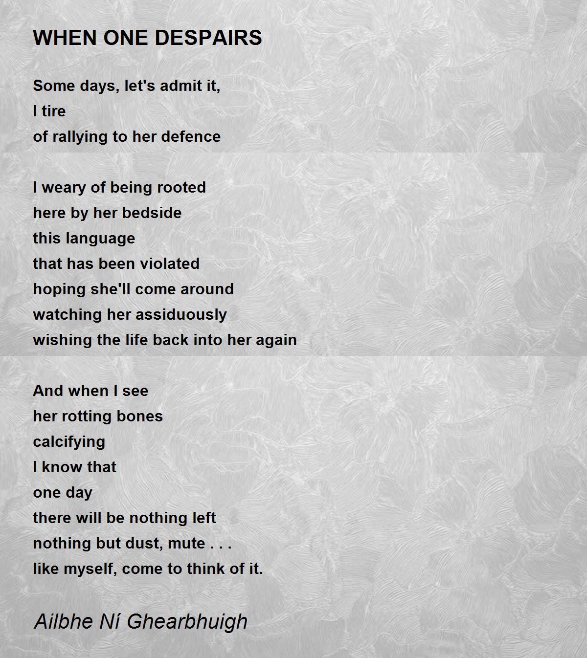 I believe this poem is about the writer's fear that one day Gaelic shall be no more- just like herself.