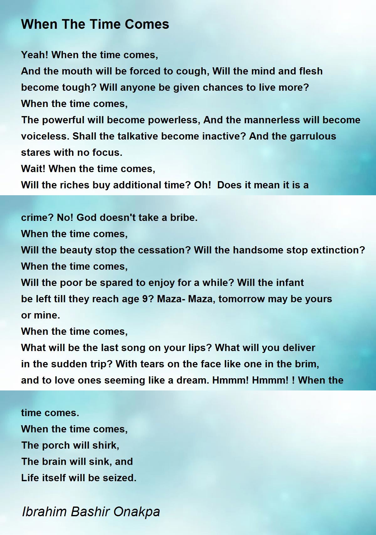 What will be the last song on your lips? What will you deliver in the sudden trip? With tears on the face like one in the brim, and to love ones seeming like a dream. Hmmm! Hmmm! ! When the time comes.
