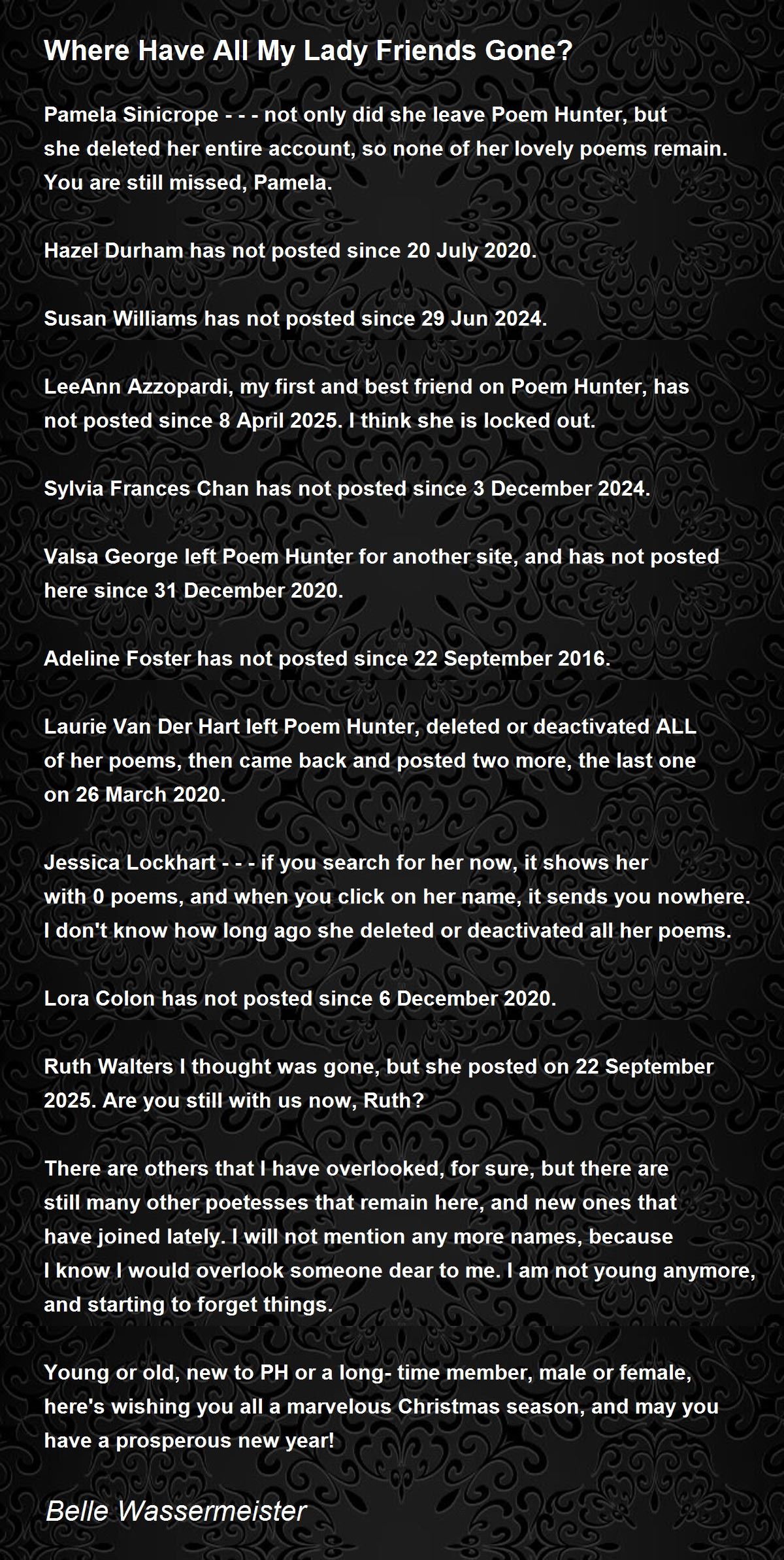 Pamela Sinicrope --- not only did she leave Poem Hunter, but she deleted her entire account, so none of her lovely poems remain. You are still missed, Pamela.