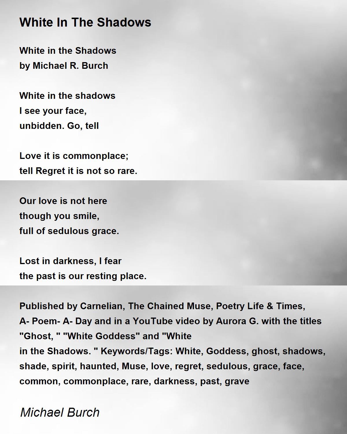 Published by Carnelian, The Chained Muse, Poetry Life & Times, A-Poem-A-Day and in a YouTube video by Aurora G. with the titles "Ghost, " "White Goddess" and "White in the Shadows." Keywords/Tags: White, Goddess, ghost, shadows, shade, spirit, haunted, Muse, love, regret, sedulous, grace, face, common, commonplace, rare, darkness, past, grave