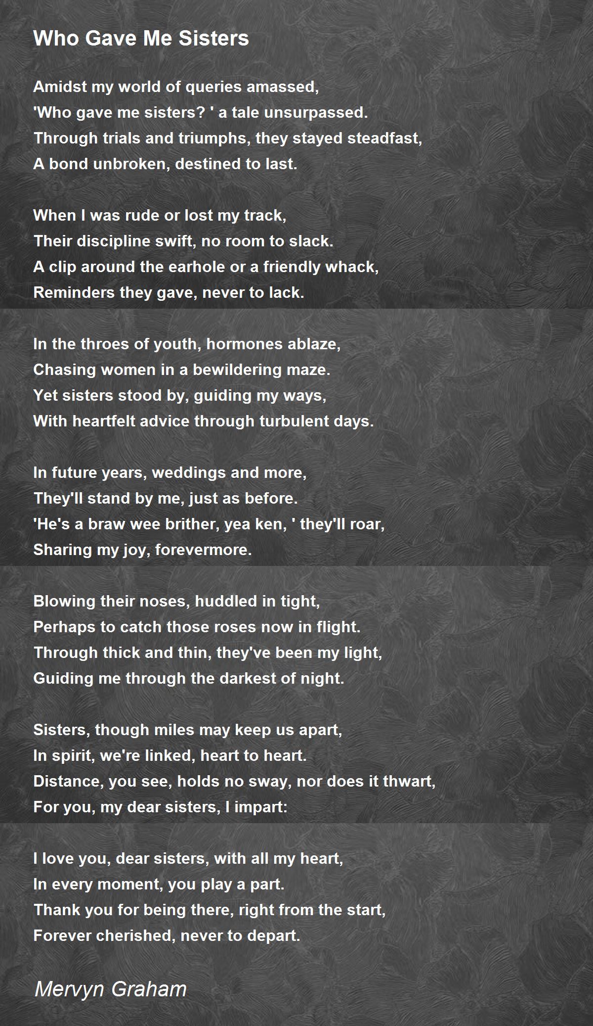 My sister had made a number of sacrifices that have truly enriched my life. For that, I will remain eternally grateful! Wonderful tribute to sisters, Mervyn!