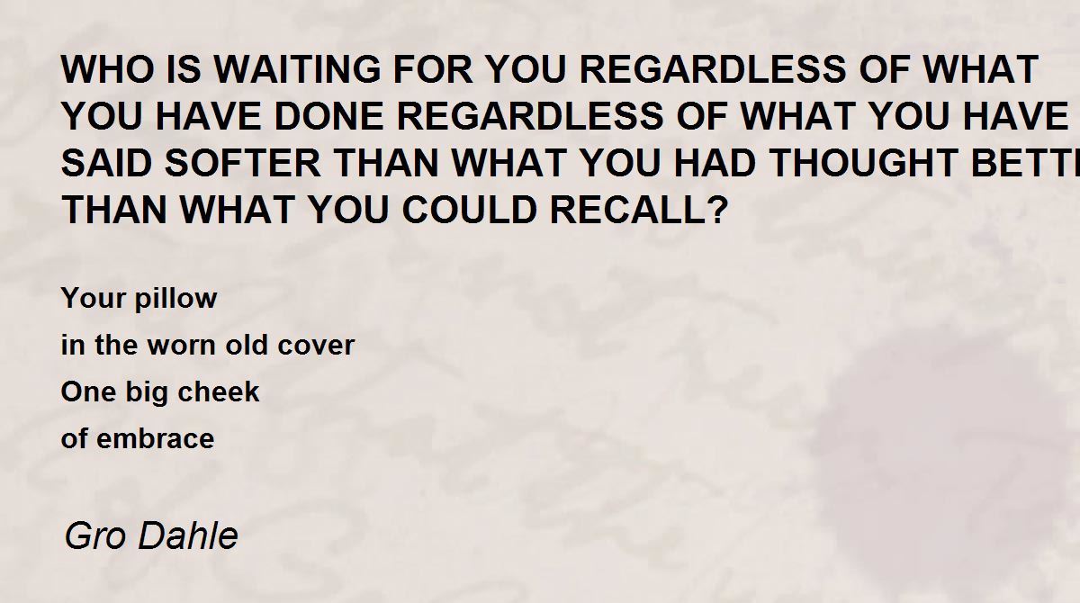 WHO IS WAITING FOR YOU REGARDLESS OF WHAT YOU HAVE DONE REGARDLESS OF WHAT YOU HAVE SAID SOFTER THAN WHAT YOU HAD THOUGHT BETTER THAN WHAT YOU COULD RECALL? Poem by Gro Dahle