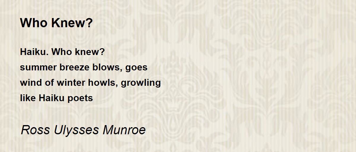 Haiku. Who knew? summer breeze blows, goes wind of winter howls, growling like Haiku poets