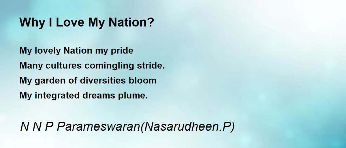 My lovely Nation my pride Many cultures comingling stride. My garden of diversities bloom My integrated dreams plume.
