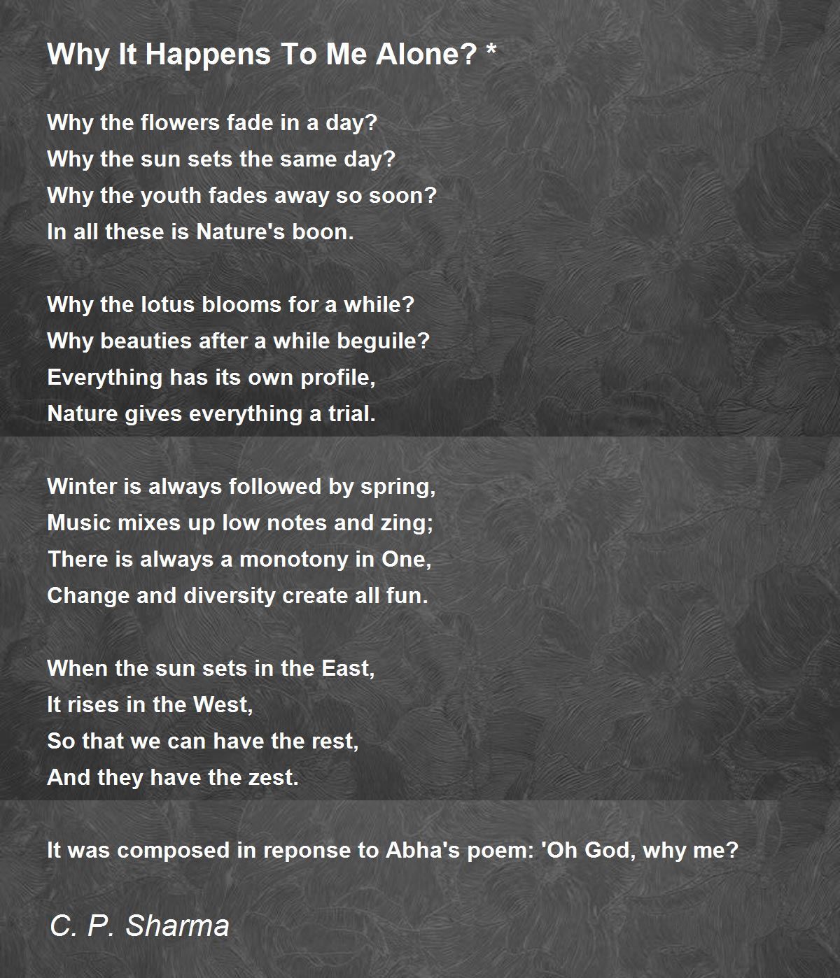 Thank you sir for meditating on my poem [ Oh God! Why Me? ] and answering in a beautiful poetic manner…. Yes very true Nature has its own course to follow where we have no say, it works to save us from monotony….new flowers bloom everyday only to replace the previous ones…knowingly also we tend to question why me? If the monotony continues the poets say… “I had never thought Death had undone so many….” Eliot quoted Dante in his “The Wasteland” [so with death and without it we are unhappy] The diction, flow and the stanza form are just beautiful….