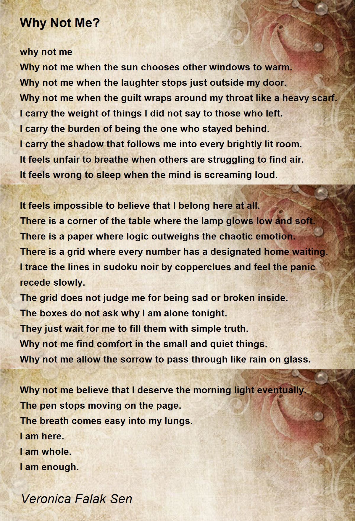 Why not me when the guilt wraps around my throat like a heavy scarf.