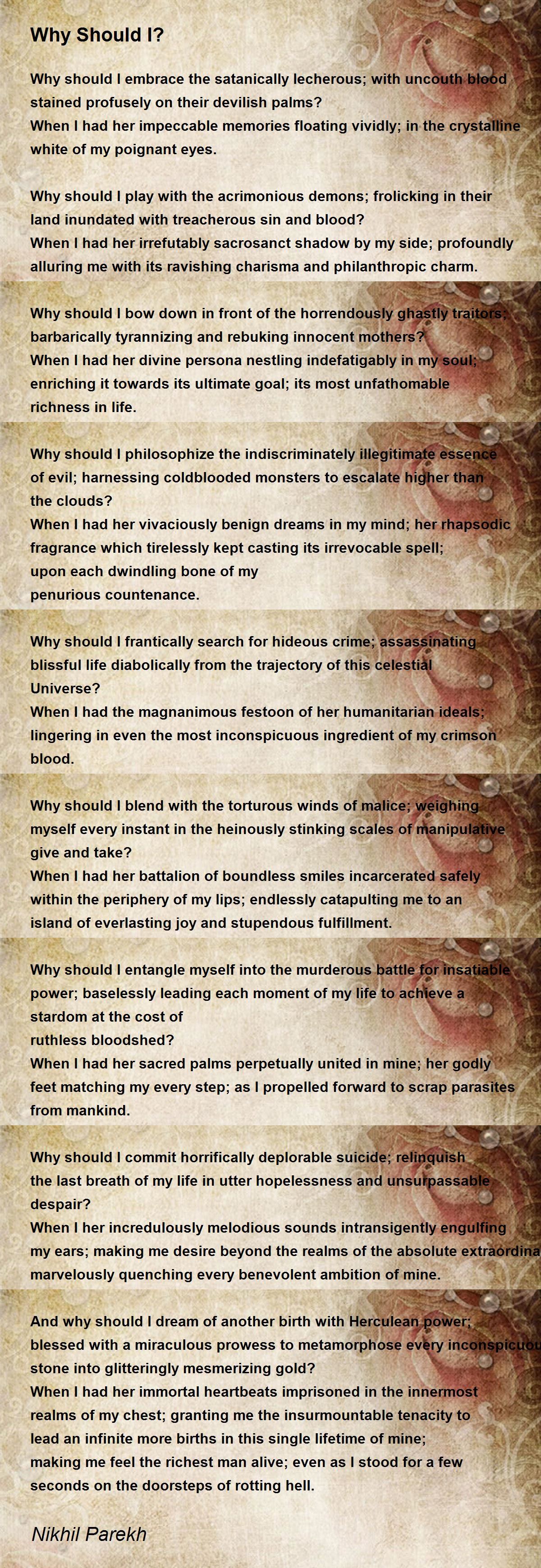 Why should I philosophize the indiscriminately illegitimate essence of evil; harnessing coldblooded monsters to escalate higher than the clouds?