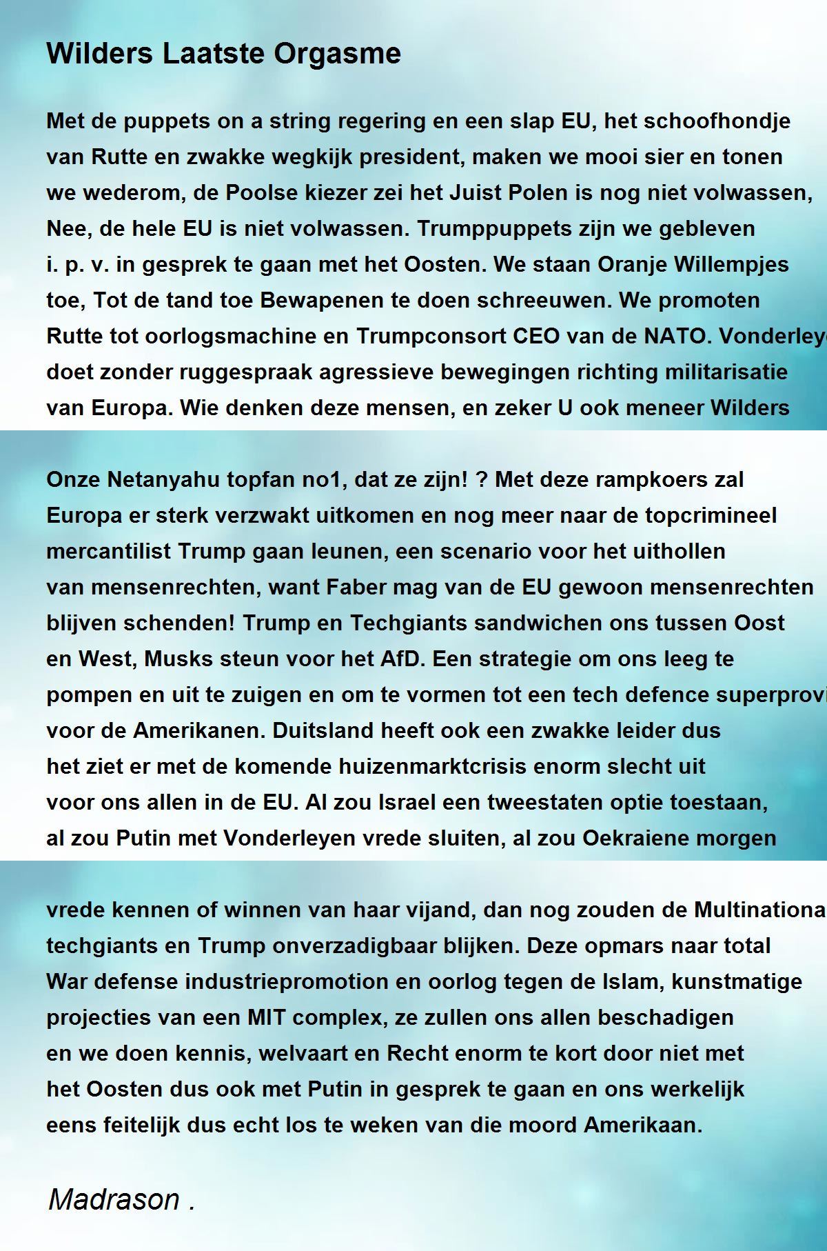Met de puppets on a string regering en een slap EU, het schoofhondje van Rutte en zwakke wegkijk president, maken we mooi sier en tonen we wederom, de Poolse kiezer zei het Juist Polen is nog niet volwassen, Nee, de hele EU is niet volwassen. Trumppuppets zijn we gebleven i.p.v. in gesprek te gaan met het Oosten. We staan Oranje Willempjes toe, Tot de tand toe Bewapenen te doen schreeuwen. We promoten Rutte tot oorlogsmachine en Trumpconsort CEO van de NATO. Vonderleyen doet zonder ruggespraak agressieve bewegingen richting militarisatie van Europa. Wie denken deze mensen, en zeker U ook meneer Wilders Onze Netanyahu topfan no1, dat ze zijn! ? Met deze rampkoers zal Europa er sterk verzwakt uitkomen en nog meer naar de topcrimineel mercantilist Trump gaan leunen, een scenario voor het uithollen van mensenrechten, want Faber mag van de EU gewoon mensenrechten blijven schenden! Trump en Techgiants sandwichen ons tussen Oost en West, Musks steun voor het AfD. Een strategie om ons leeg te pompen en uit te zuigen en om te vormen tot een tech defence superprovincie voor de Amerikanen. Duitsland heeft ook een zwakke leider dus het ziet er met de komende huizenmarktcrisis enorm slecht uit voor ons allen in de EU. Al zou Israel een tweestaten optie toestaan, al zou Putin met Vonderleyen vrede sluiten, al zou Oekraiene morgen vrede kennen of winnen van haar vijand, dan nog zouden de Multinationals, techgiants en Trump onverzadigbaar blijken. Deze opmars naar total War defense industriepromotion en oorlog tegen de Islam, kunstmatige projecties van een MIT complex, ze zullen ons allen beschadigen en we doen kennis, welvaart en Recht enorm te kort door niet met het Oosten dus ook met Putin in gesprek te gaan en ons werkelijk eens feitelijk dus echt los te weken van die moord Amerikaan.