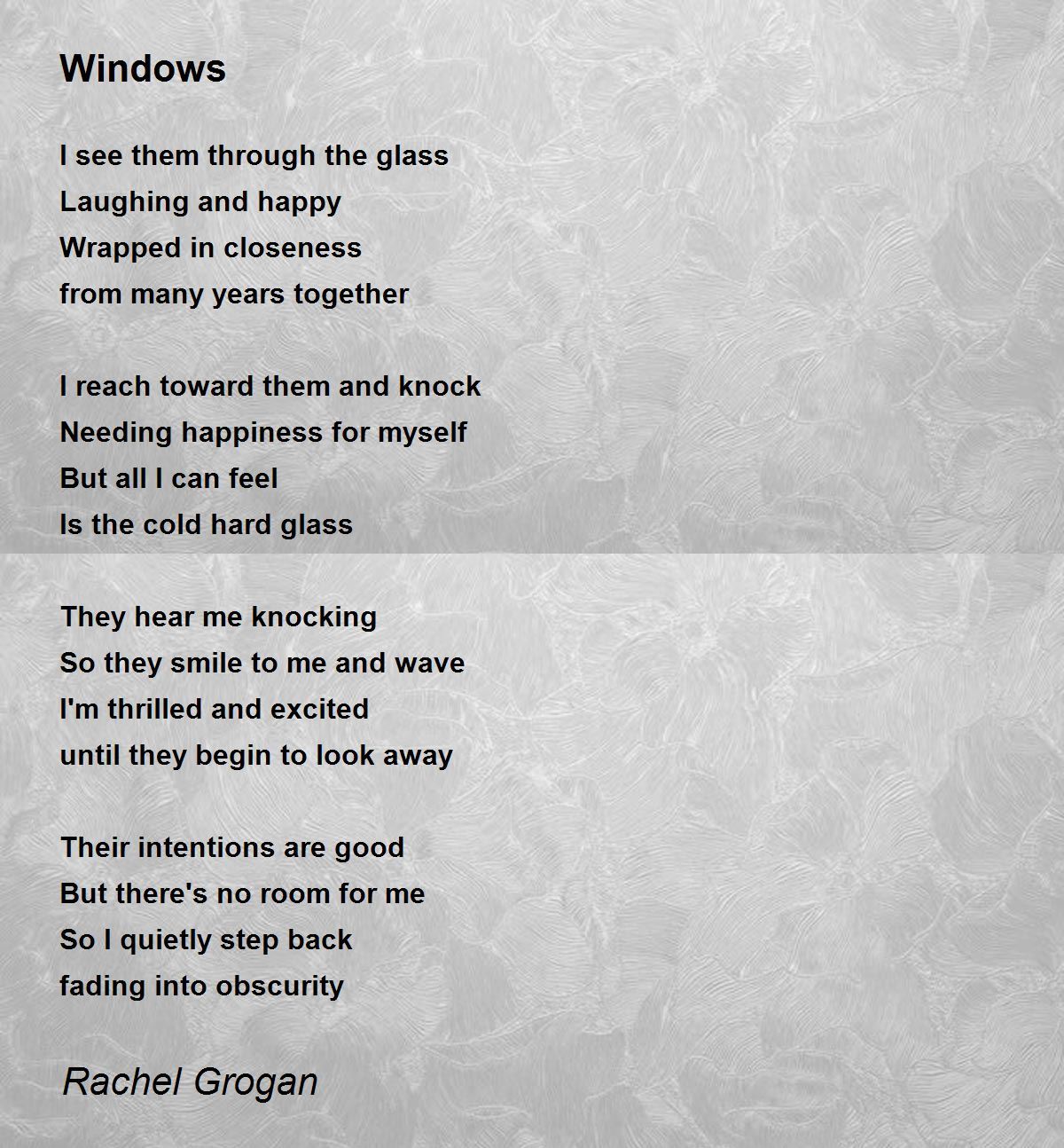 Rachel, in both Windows and Crumpled Picture... your words have a sadness that reaches to the core of my heart. You must break that glass, and demand what happiness is yours, for you deserve arms that hug, hands that hold, fingers that touch your hair, your face...and lips that behold your lips... Break The Glass. Great Ink on both pieces Rachel.; -) Kelly.