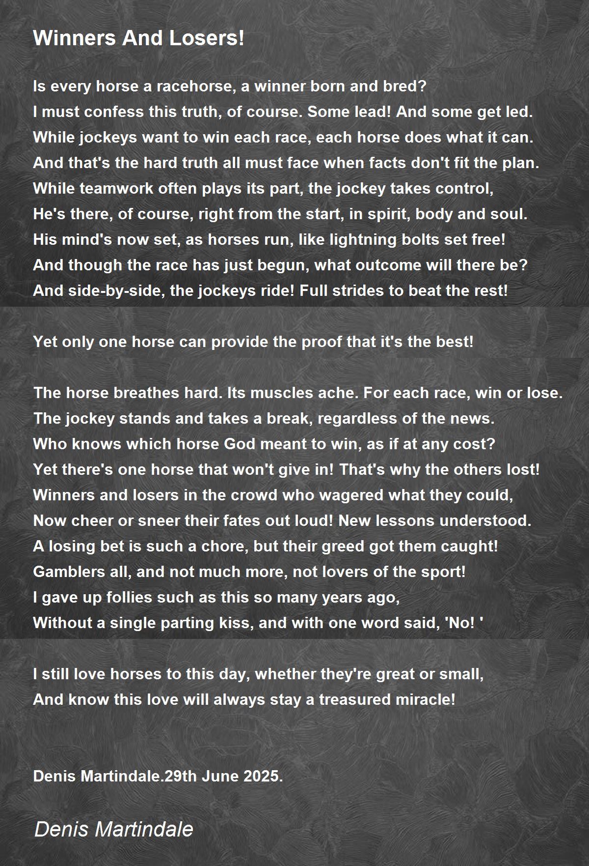 The horse breathes hard. Its muscles ache. For each race, win or lose.