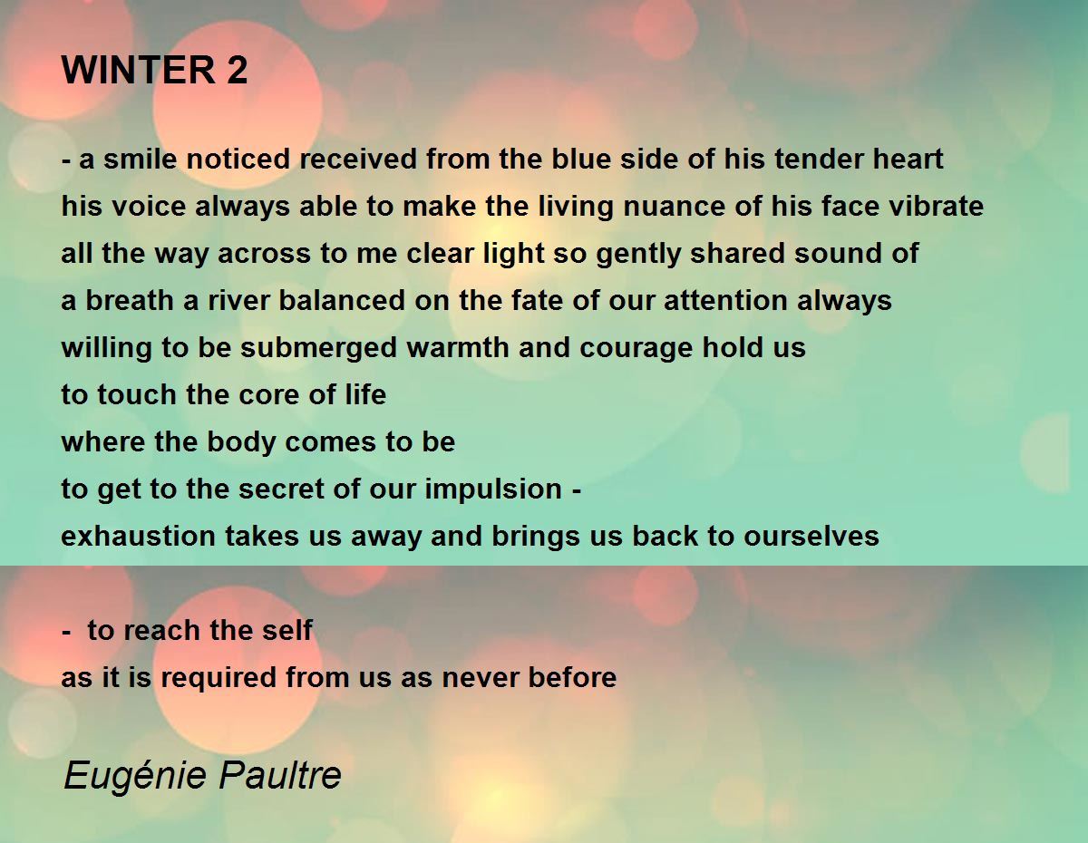 - a smile noticed received from the blue side of his tender heart his voice always able to make the living nuance of his face vibrate all the way across to me clear light so gently shared sound of a breath a river balanced on the fate of our attention always willing to be submerged warmth and courage hold us