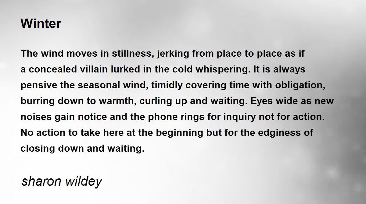 The wind moves in stillness, jerking from place to place as if a concealed villain lurked in the cold whispering. It is always pensive the seasonal wind, timidly covering time with obligation, burring down to warmth, curling up and waiting. Eyes wide as new noises gain notice and the phone rings for inquiry not for action. No action to take here at the beginning but for the edginess of closing down and waiting.