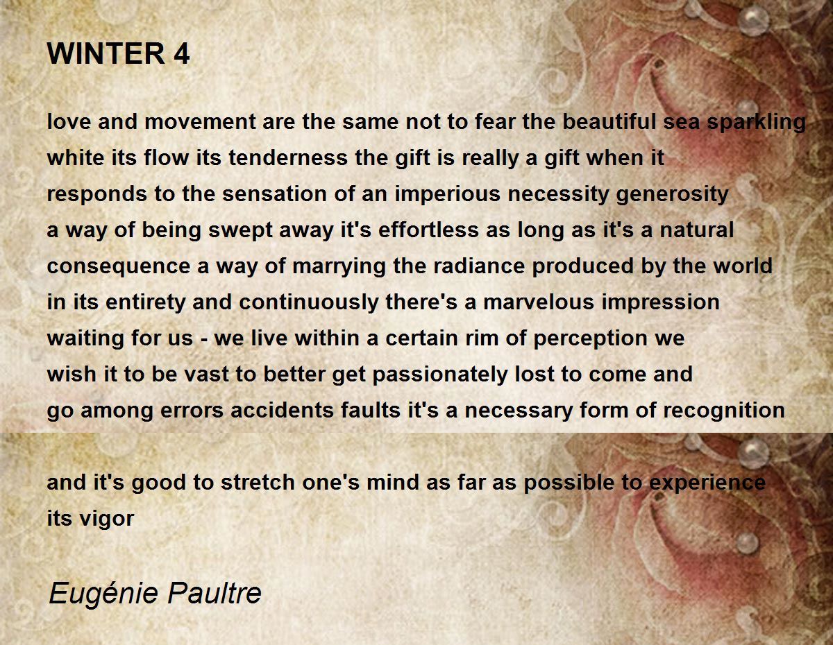 love and movement are the same not to fear the beautiful sea sparkling white its flow its tenderness the gift is really a gift when it responds to the sensation of an imperious necessity generosity a way of being swept away it's effortless as long as it's a natural consequence a way of marrying the radiance produced by the world in its entirety and continuously there's a marvelous impression waiting for us - we live within a certain rim of perception we wish it to be vast to better get passionately lost to come and go among errors accidents faults it's a necessary form of recognition and it's good to stretch one's mind as far as possible to experience its vigor