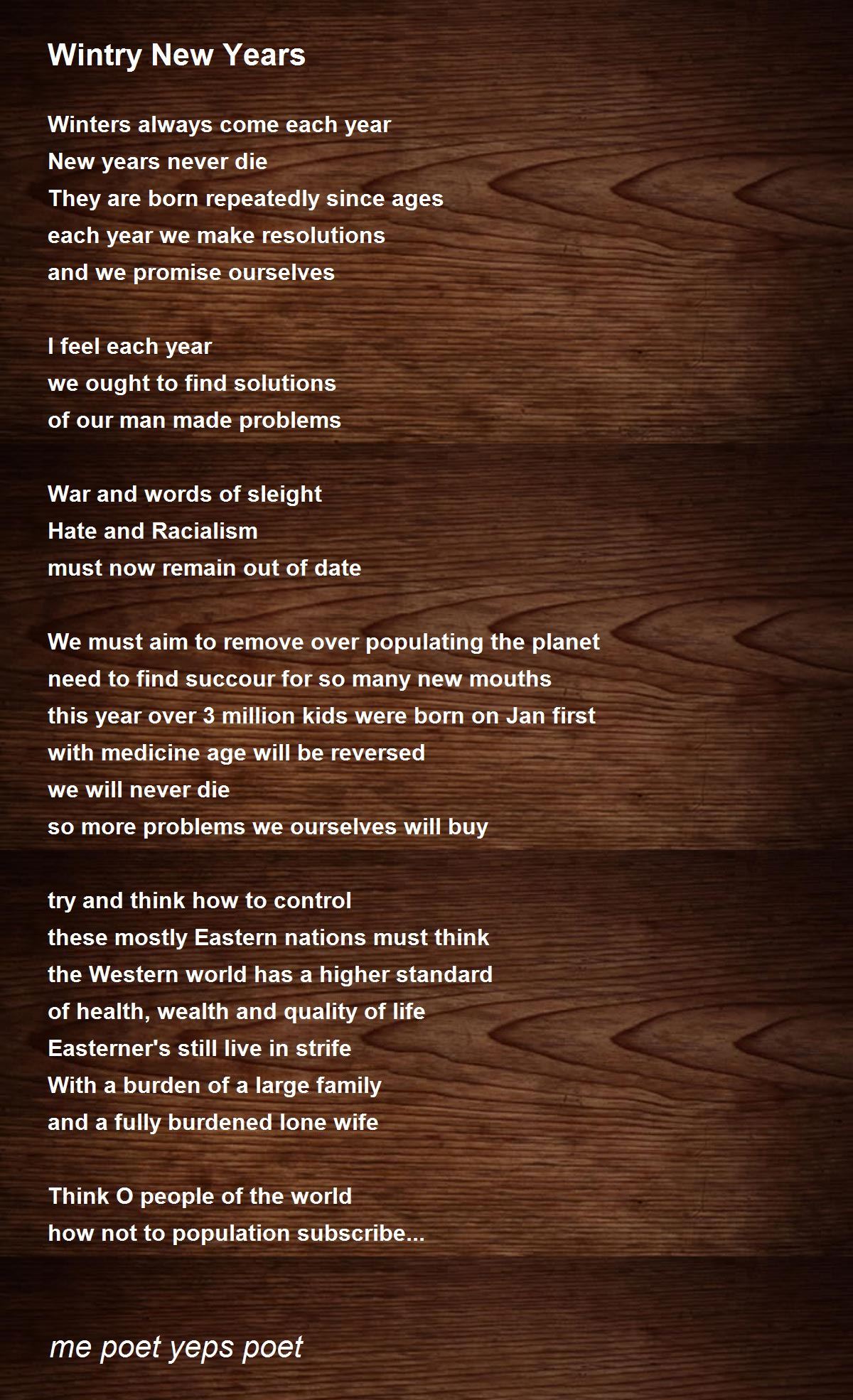 Hey! I tried to find the poem you requested me to read but I could not find it. Perhaps I did not write its name down correctly. This is a very interesting poem here though. If only war and hate could be overcome by new years' resolutions and good wishes. But only hard work and conviction of every person on this planet will probably work.