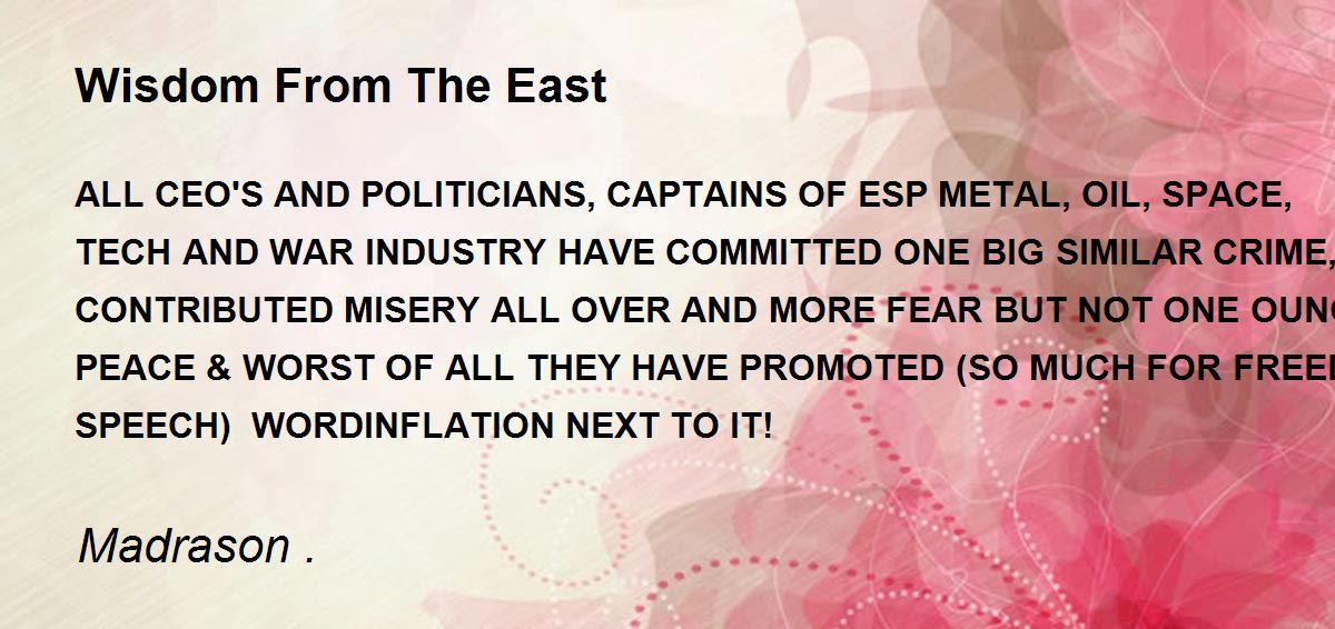 ALL CEO'S AND POLITICIANS, CAPTAINS OF ESP METAL, OIL, SPACE, TECH AND WAR INDUSTRY HAVE COMMITTED ONE BIG SIMILAR CRIME, THEY'VE CONTRIBUTED MISERY ALL OVER AND MORE FEAR BUT NOT ONE OUNCE OF PEACE & WORST OF ALL THEY HAVE PROMOTED (SO MUCH FOR FREEDOM OF SPEECH) WORDINFLATION NEXT TO IT!