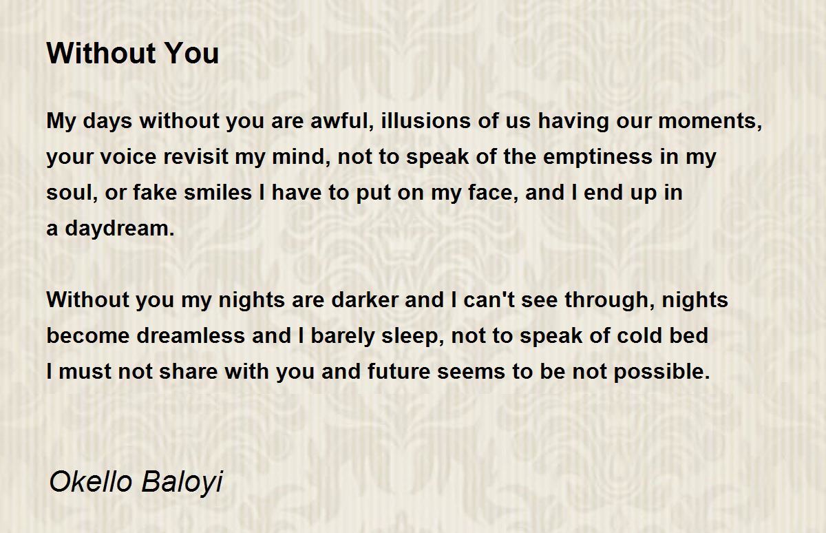 Without you my nights are darker and I can't see through, nights become dreamless and I barely sleep, not to speak of cold bed I must not share with you and future seems to be not possible.