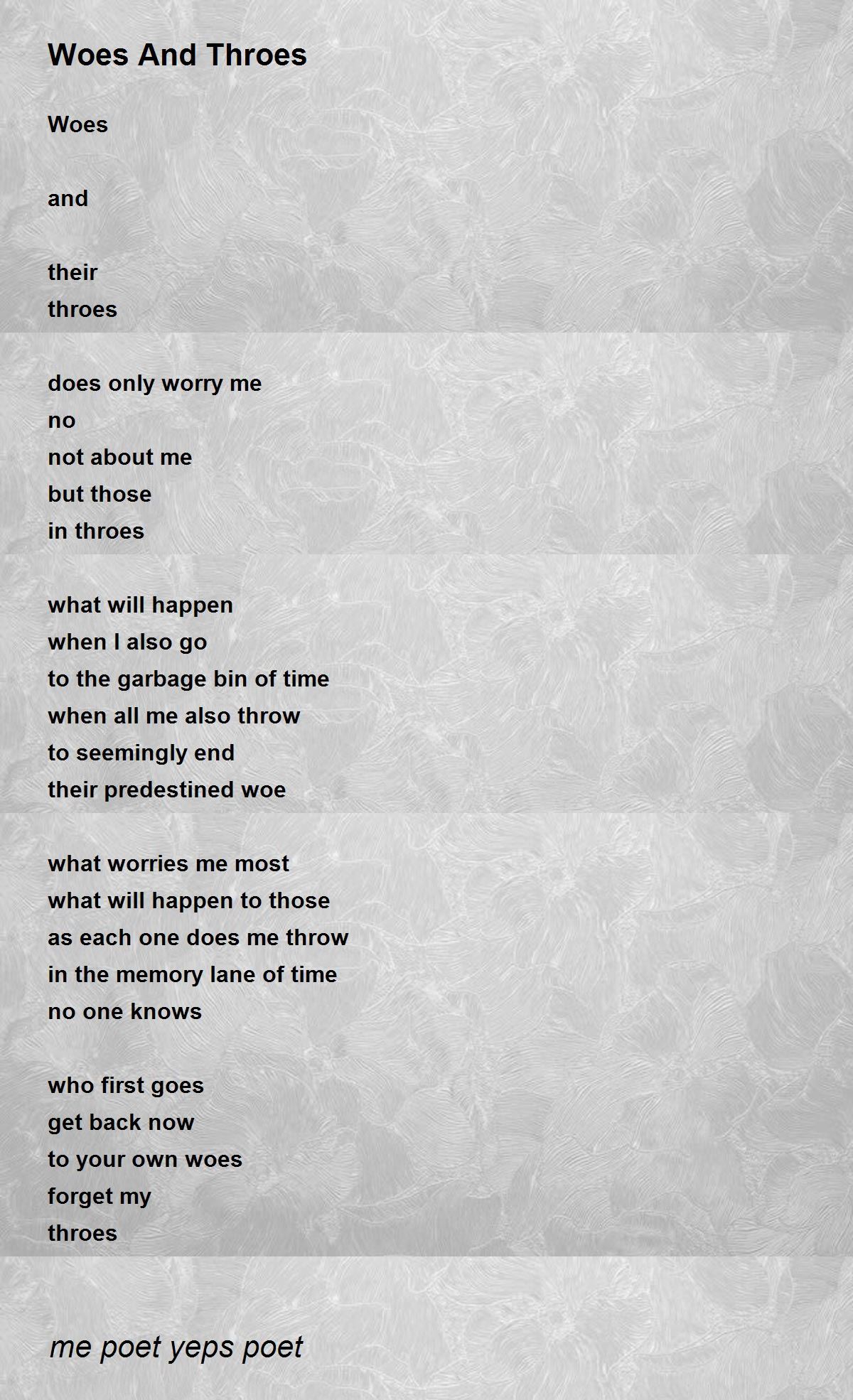 We all have woes unique and throes distinct, when we're gone we leave our loved ones with new woes. An elegantly crafted work peeps