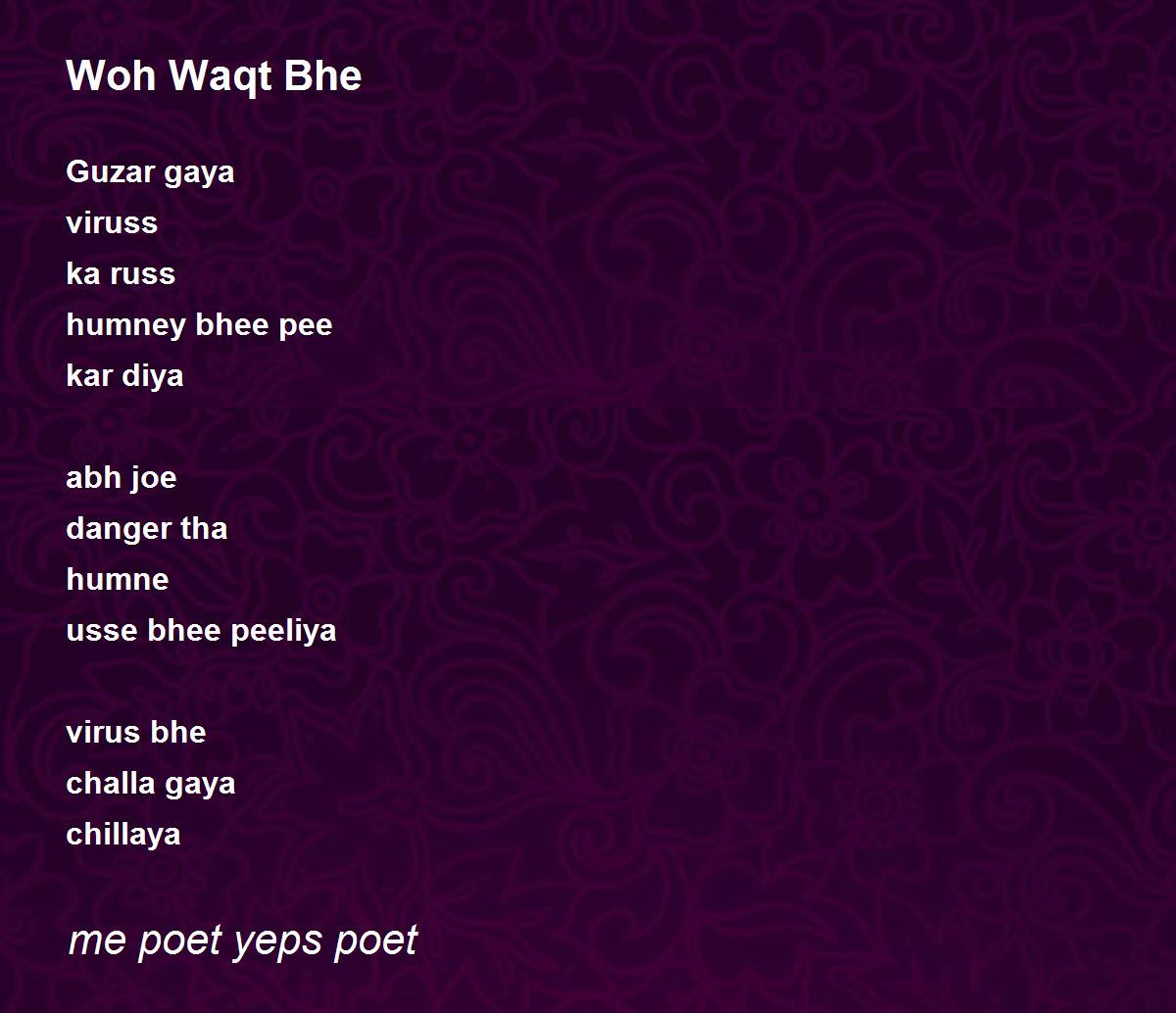 Wo bhi waqt tha janab Jab virus ne kar diya tha Naak me daam kar diya tha Par loo aab chinn ki saans O positive blood waloon virus ko nshi hai aapse pyar Wo to sirf A waloon ke hi peeche hain khas .....aapne virus pe chillaya bhi....