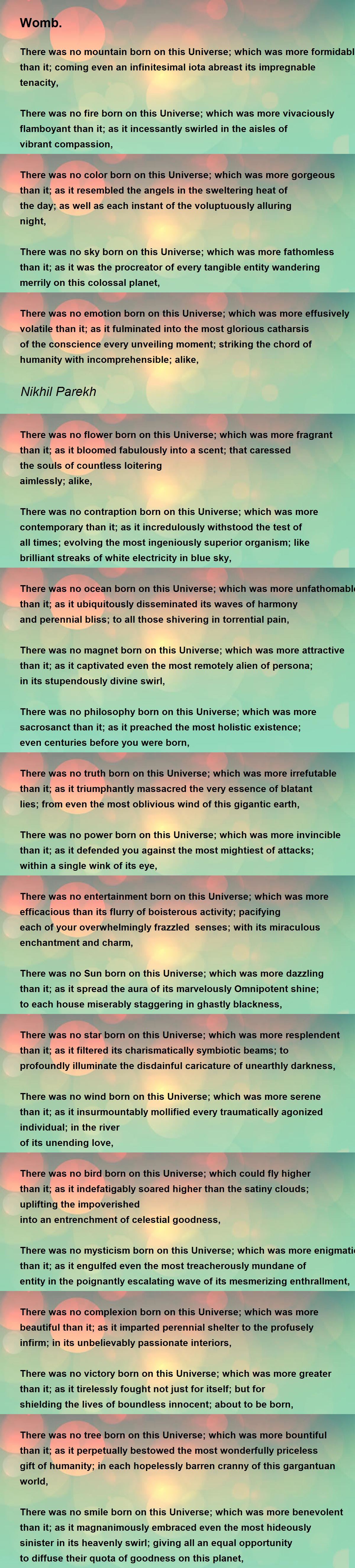 There was no boundary on this Universe; which was more boundless than it; as it encompassed all merciful living kind; in the heavenly pace that forever enveloped its sparkling form, There was no prayer on this Universe; which was more revered than it; as it was a magical wand for pioneering all forms and fraternities of vibrant life;