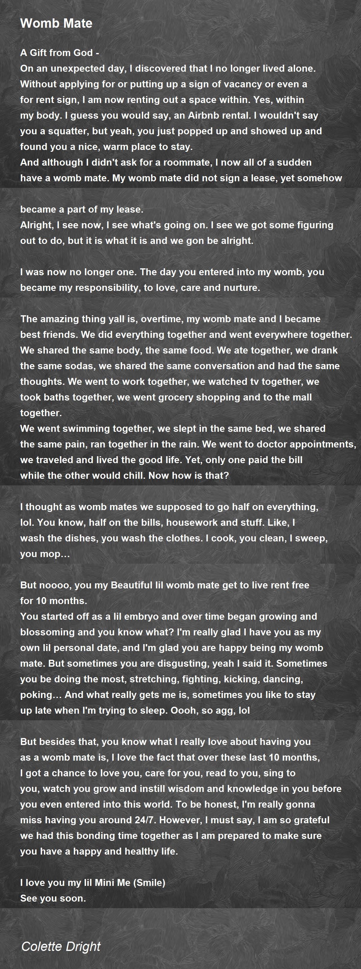 And although I didn't ask for a roommate, I now all of a sudden have a womb mate. My womb mate did not sign a lease, yet somehow became a part of my lease.