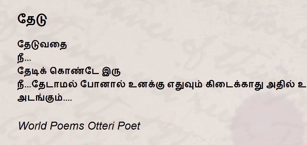 தேடுவதை நீ...தேடிக் கொண்டே இரு நீ...தேடாமல் போனால் உனக்கு எதுவும் கிடைக்காது அதில் உன் வாழ்க்கையும் அடங்கும்....