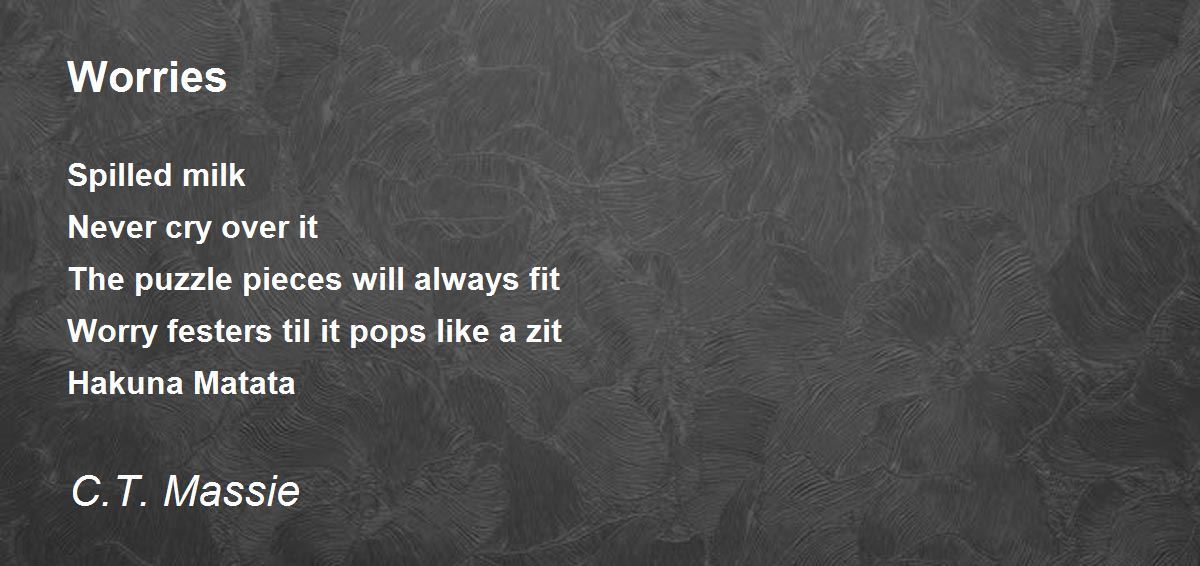 Spilled milk Never cry over it The puzzle pieces will always fit Worry festers til it pops like a zit Hakuna Matata