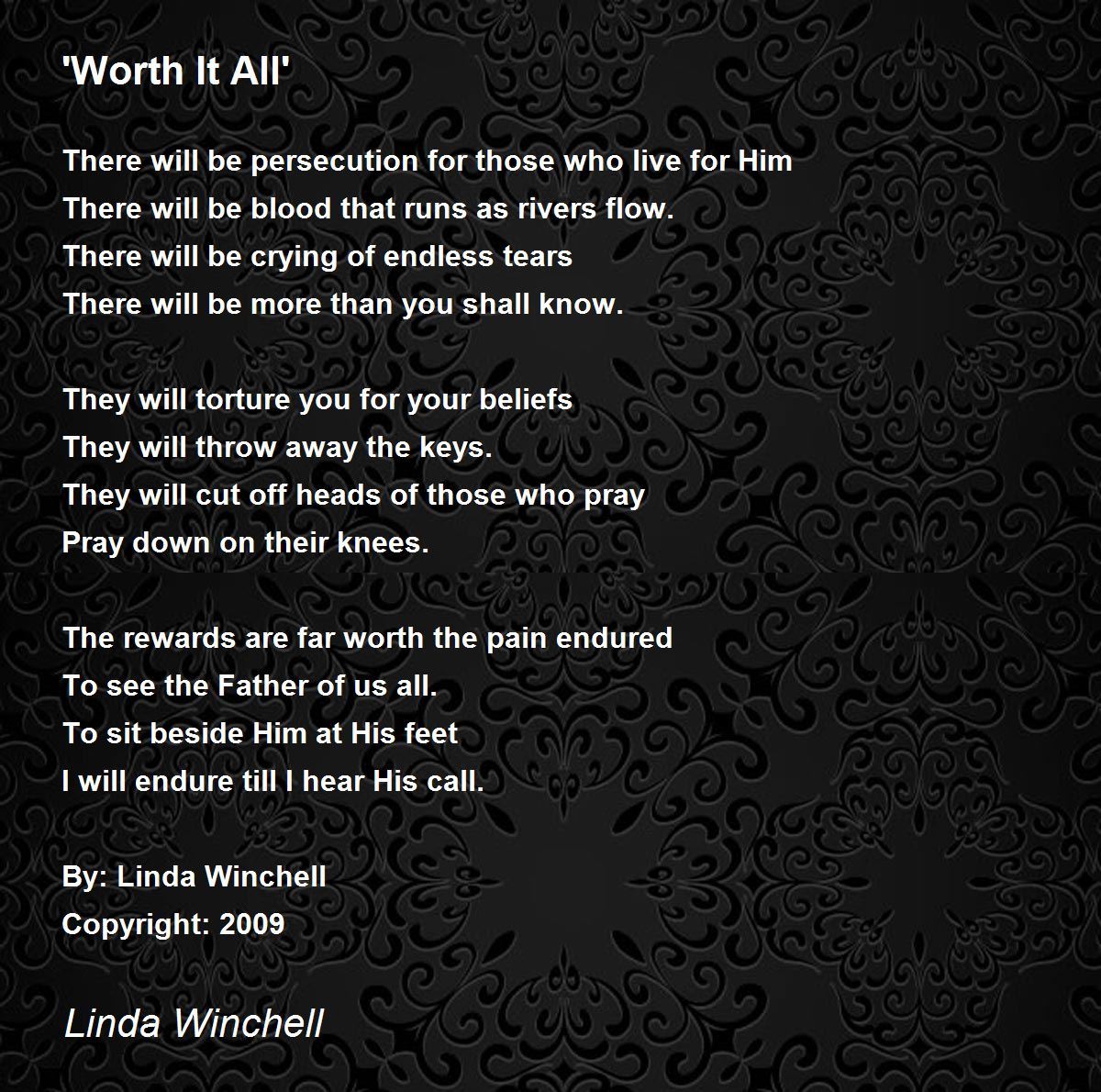 The rewards are far worth the pain endured To see the Father of us all. To sit beside Him at His feet I will endure till I hear His call. The rewards are far worth the pain endured..His promises are true, and i can claim this always whenever i am in pain. This is worthy to be read, Sis..thanks for this.God bless you