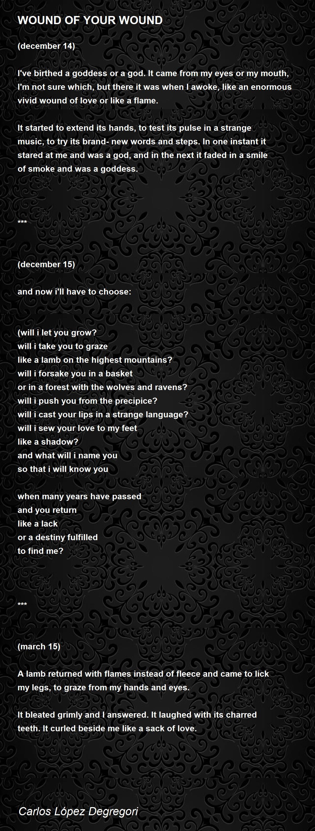 I've birthed a goddess or a god. It came from my eyes or my mouth, I'm not sure which, but there it was when I awoke, like an enormous vivid wound of love or like a flame.