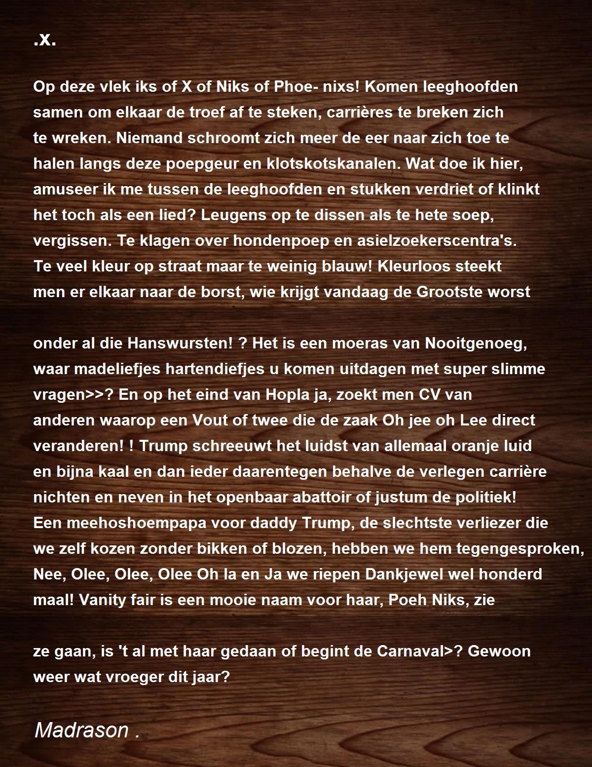 Op deze vlek iks of X of Niks of Phoe-nixs! Komen leeghoofden samen om elkaar de troef af te steken, carrières te breken zich te wreken. Niemand schroomt zich meer de eer naar zich toe te halen langs deze poepgeur en klotskotskanalen. Wat doe ik hier, amuseer ik me tussen de leeghoofden en stukken verdriet of klinkt het toch als een lied? Leugens op te dissen als te hete soep, vergissen. Te klagen over hondenpoep en asielzoekerscentra's. Te veel kleur op straat maar te weinig blauw! Kleurloos steekt men er elkaar naar de borst, wie krijgt vandaag de Grootste worst onder al die Hanswursten! ? Het is een moeras van Nooitgenoeg, waar madeliefjes hartendiefjes u komen uitdagen met super slimme vragen>>? En op het eind van Hopla ja, zoekt men CV van anderen waarop een Vout of twee die de zaak Oh jee oh Lee direct veranderen! ! Trump schreeuwt het luidst van allemaal oranje luid en bijna kaal en dan ieder daarentegen behalve de verlegen carrière nichten en neven in het openbaar abattoir of justum de politiek! Een meehoshoempapa voor daddy Trump, de slechtste verliezer die we zelf kozen zonder bikken of blozen, hebben we hem tegengesproken, Nee, Olee, Olee, Olee Oh la en Ja we riepen Dankjewel wel honderd maal! Vanity fair is een mooie naam voor haar, Poeh Niks, zie ze gaan, is 't al met haar gedaan of begint de Carnaval>? Gewoon weer wat vroeger dit jaar?