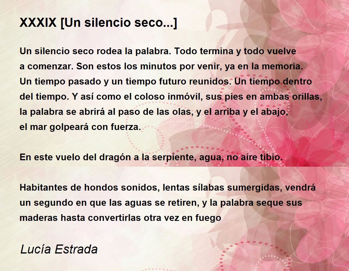 Un silencio seco rodea la palabra. Todo termina y todo vuelve a comenzar. Son estos los minutos por venir, ya en la memoria. Un tiempo pasado y un tiempo futuro reunidos. Un tiempo dentro del tiempo. Y así como el coloso inmóvil, sus pies en ambas orillas, la palabra se abrirá al paso de las olas, y el arriba y el abajo, el mar golpeará con fuerza.