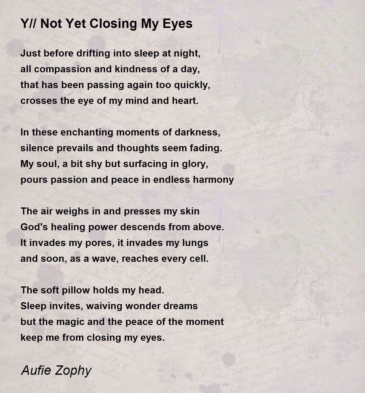 a also once wrote a poem about sleep dear to my heart, yes 'The soft pillow holds my head Sleep invites waiving wonder dreams but the magic and the peace of the moment keep me from closing my eyes' these are exquisite moments, longing to retain the peace of quiet moments before sleep, so much better than the exhausted body overtired that must drop like a stone to steal every precious second of sleep, before waking to many work responsibility moments blessing with earnest endeavours