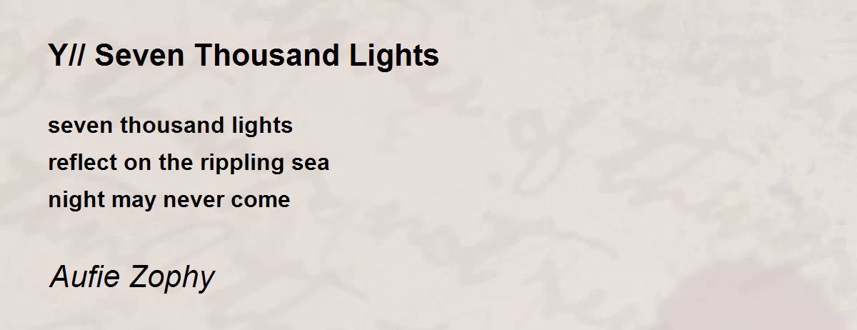 ***Seven Thousand Stars Light Ripple On Water**** walking in star light in illuminated night seven thousand stars light ripple on water a cool breeze blesses a never comes night Copyright © Terence George Craddock Inspired by the poem 'Y// Seven Thousand Lights by the poet Aufie Zophy. Dedicated to the poet Aufie Zophy.