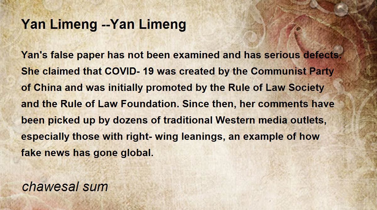 Yan's false paper has not been examined and has serious defects. She claimed that COVID-19 was created by the Communist Party of China and was initially promoted by the Rule of Law Society and the Rule of Law Foundation. Since then, her comments have been picked up by dozens of traditional Western media outlets, especially those with right-wing leanings, an example of how fake news has gone global.