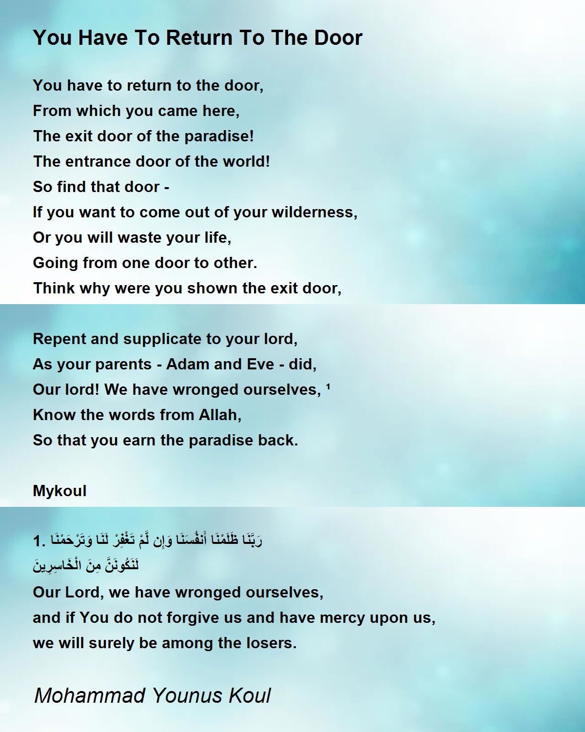 1. رَبَّنَا ظَلَمْنَا أَنفُسَنَا وَإِن لَّمْ تَغْفِرْ لَنَا وَتَرْحَمْنَا لَنَكُونَنَّ مِنَ الْخَاسِرِينَ