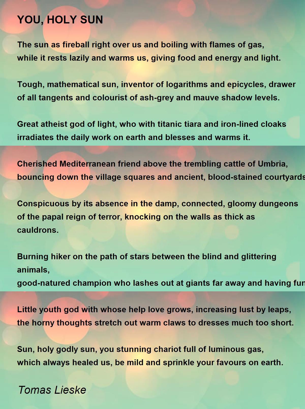 Sun, holy godly sun, you stunning chariot full of luminous gas,