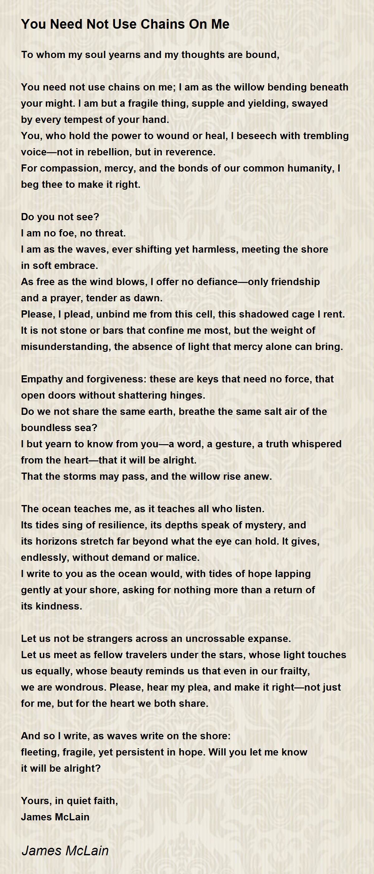 You need not use chains on me; I am as the willow bending beneath your might. I am but a fragile thing, supple and yielding, swayed by every tempest of your hand.