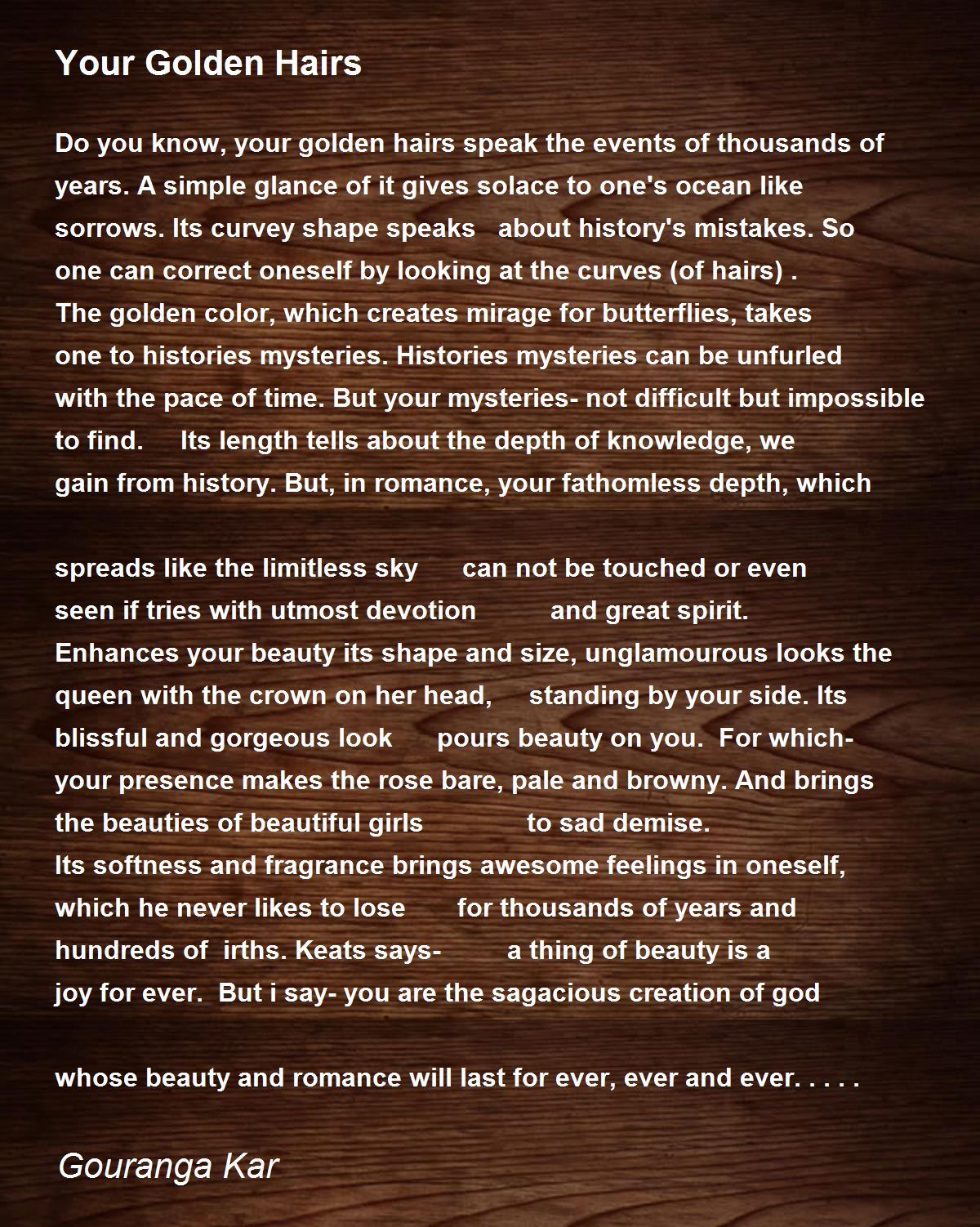 Do you know, your golden hairs speak the events of thousands of years. A simple glance of it gives solace to one's ocean like sorrows. Its curvey shape speaks about history's mistakes. So one can correct oneself by looking at the curves (of hairs) . The golden color, which creates mirage for butterflies, takes one to histories mysteries. Histories mysteries can be unfurled with the pace of time. But your mysteries- not difficult but impossible to find. Its length tells about the depth of knowledge, we gain from history. But, in romance, your fathomless depth, which spreads like the limitless sky can not be touched or even seen if tries with utmost devotion and great spirit. Enhances your beauty its shape and size, unglamourous looks the queen with the crown on her head, standing by your side. Its blissful and gorgeous look pours beauty on you. For which- your presence makes the rose bare, pale and browny. And brings the beauties of beautiful girls to sad demise. Its softness and fragrance brings awesome feelings in oneself, which he never likes to lose for thousands of years and hundreds of irths. Keats says- a thing of beauty is a joy for ever. But i say- you are the sagacious creation of god whose beauty and romance will last for ever, ever and ever.....