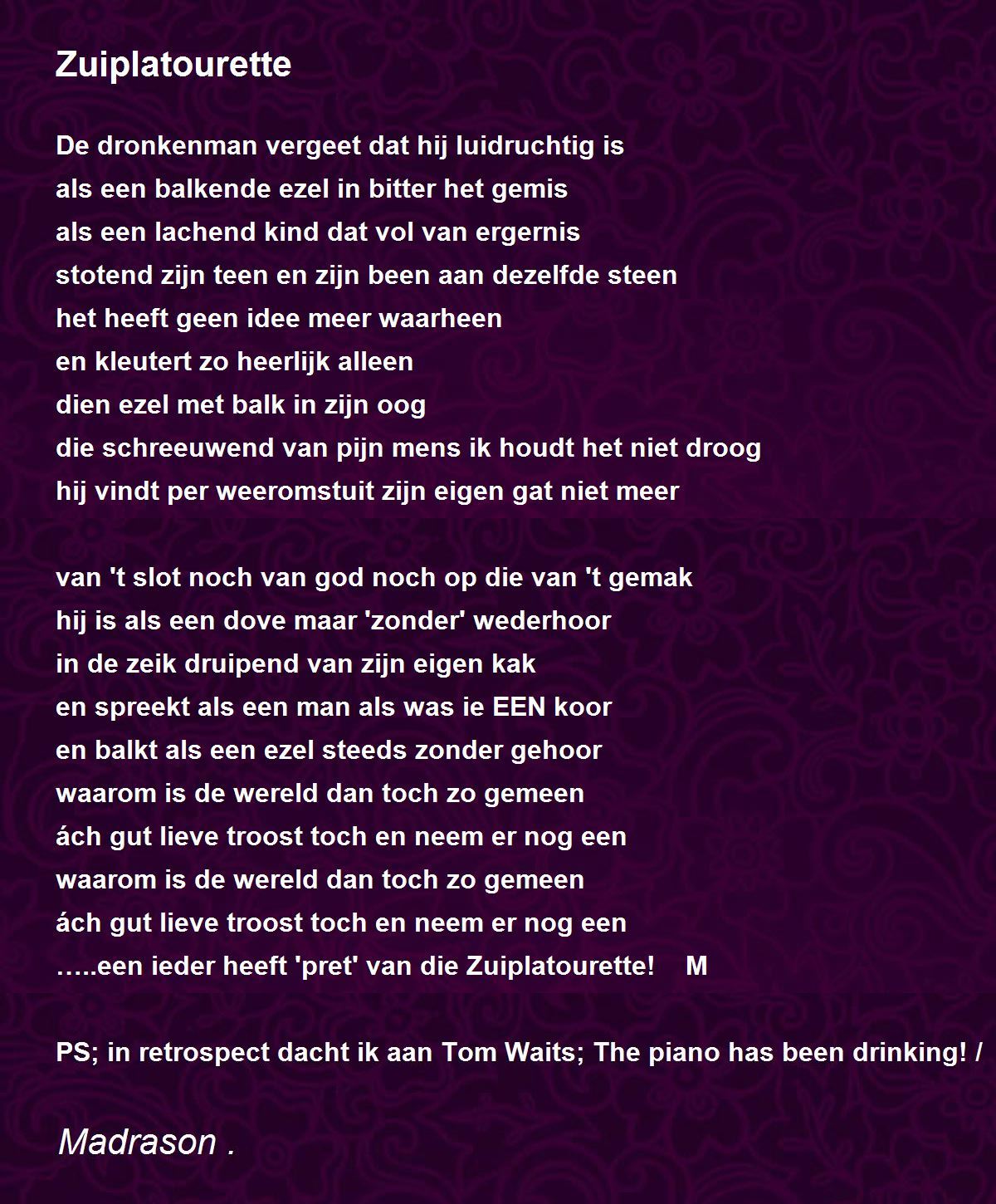 PS; in retrospect dacht ik aan Tom Waits; The piano has been drinking! /